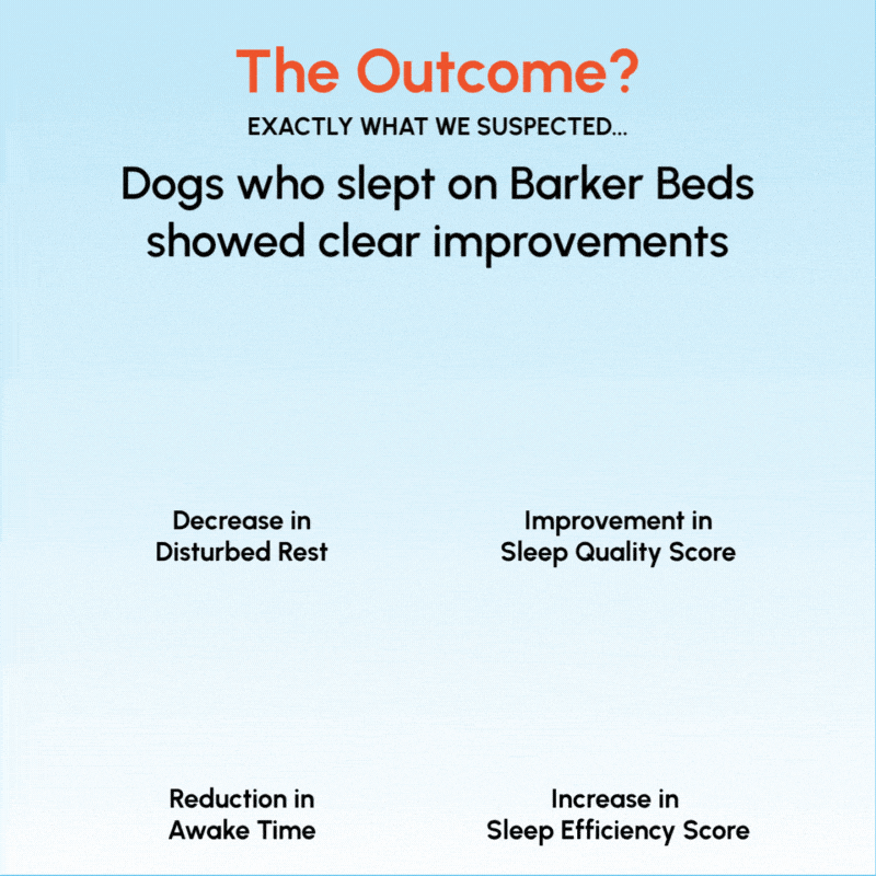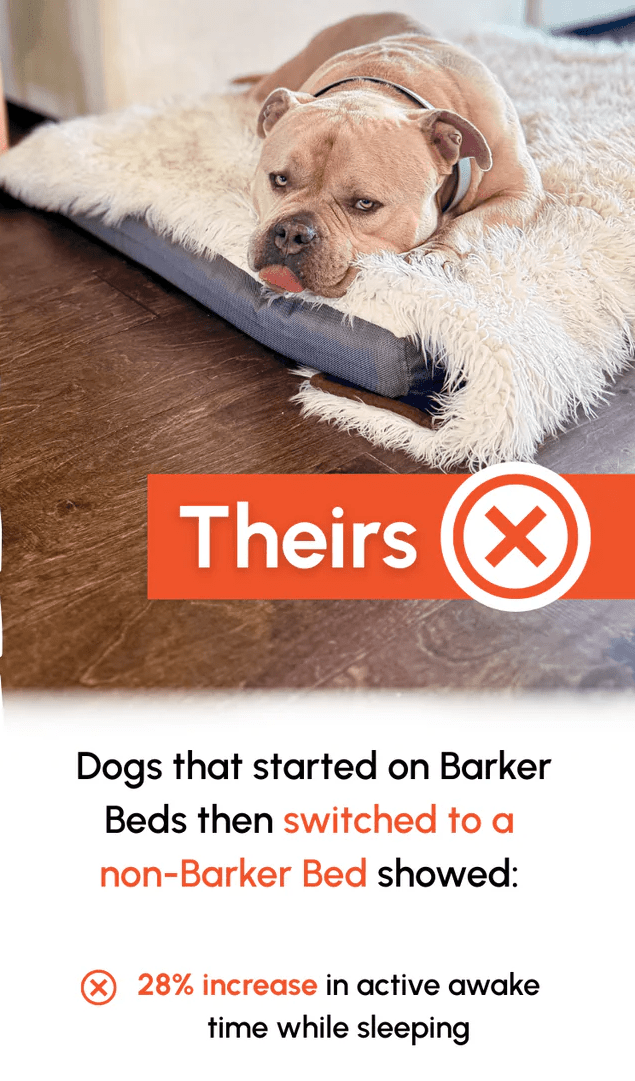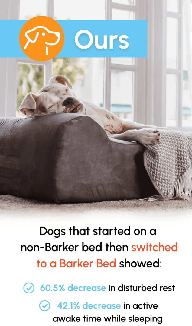 - Dogs who switched from a non-Barker bed to a Barker Bed showed a 60.5% decrease in disturbed rest and a 42.1% decrease in active awake time.