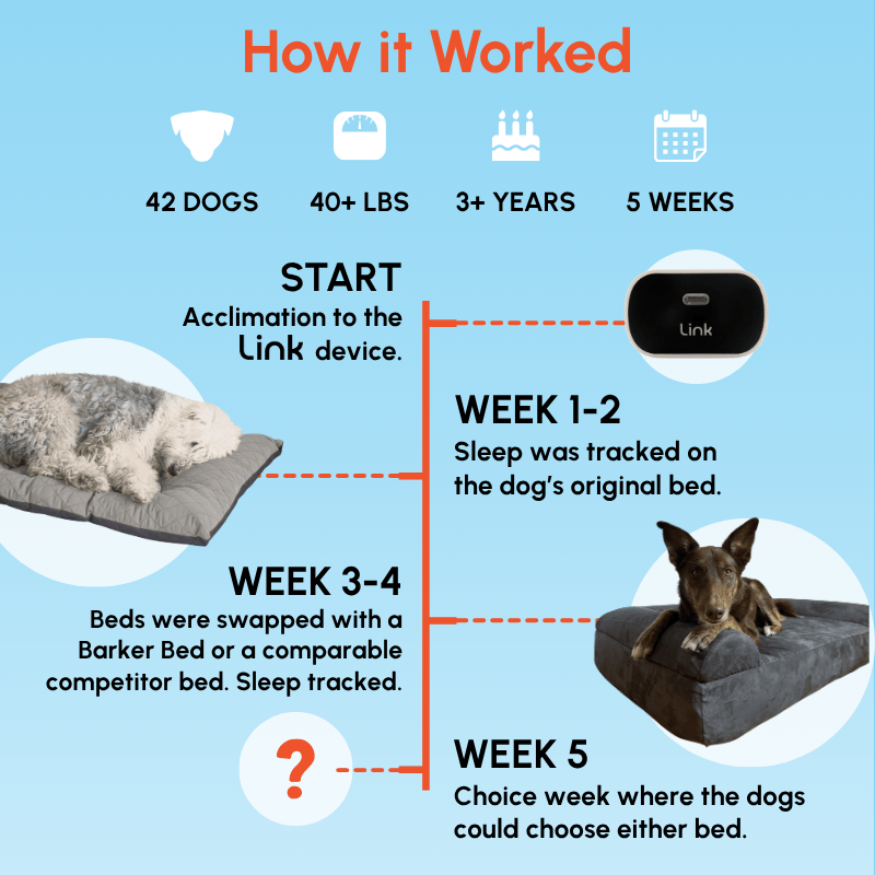 The study followed 42 dogs across 36 households. Each dog experienced both a Barker Bed and a non-Barker bed in a rotating schedule to compare rest and recovery on each surface. Dogs wore LinkMyPet’s smart collars throughout the process and followed this five-week protocol:
